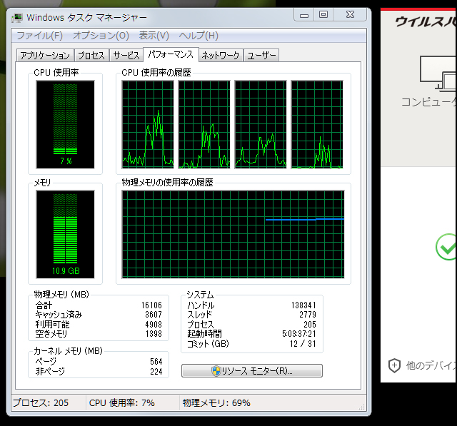 CPUの使用率は7%と低めです。 メモリ使用量が多いのはブラウザのタブで非常に多くのページを開いているのと、画像編集ソフトを起動させているためです。 大体、いつも私はこのような状態で作業を行っています。 次に、ウイルスバスタークラウドでカスタムスキャンを実行した場合の負荷です。