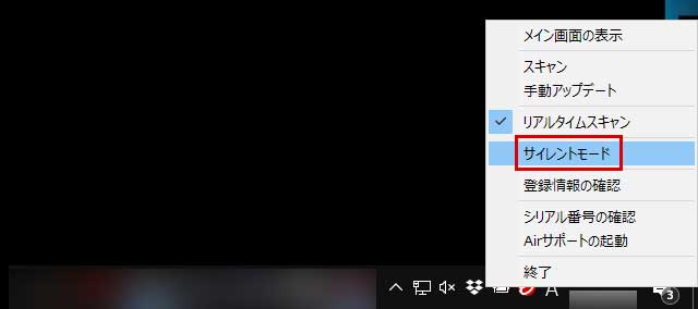 ・予約スキャン サイレントモードが有効であっても、パソコン全体の保護機能(リアルタイムスキャン)は有効となっているため、 安全性には問題ありません。 サイレントモードの設定は以下の方法で行えます。 まず、デスクトップ右下のタスクトレイ内に表示されている、ウイルスバスタークラウドのアイコンを右クリックし、 表示されたコンテキストメニュー内にある「サイレントモード」をさらにクリックしてください。 ![]() 「サイレントモード」をクリック サイレントモードの設定画面が表示されます。