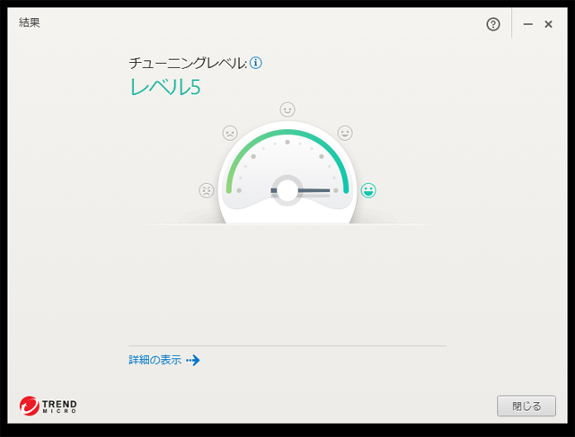 システムチューナーによるチューニングが完了すると、その結果がレベル1~5の5段階で表示されます。 数字が大きいほどセキュリティリスクがないことを示しています。 レベル5だと全く問題がなく、見直ししなくてはならない設定が多いほどレベルが低くなります。 見直ししなくてはならない設定に関しては、結果画面の左下に表示されている「詳細の表示」より閲覧できます。
