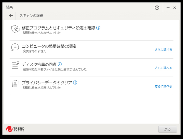 詳細はこの通り。 修正プログラム(更新プログラム)やセキュリティ設定、コンピューターの起動時間、ディスク容量、 プライバシーデータのクリアなどにおいて問題がないという結果です。 もし問題があると出た場合は、必要に応じて設定を修正してください。 システムチューナーの設定変更のしかた