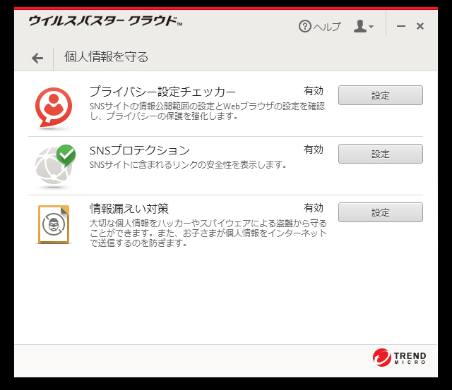 まず、ウイルスバスタークラウドのメイン画面を起動し、上部のメニューより「個人情報を守る」をクリックして開きます。 ![]() 「個人情報を守る」をクリック
