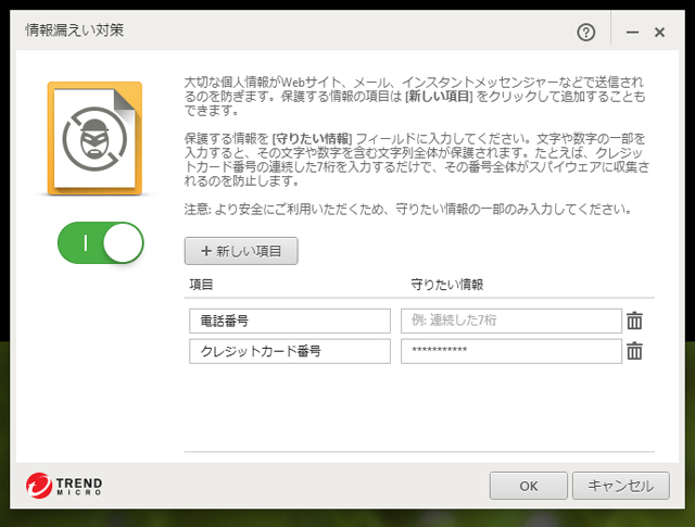 これは、クレジットカードの番号や電話番号、マイナンバー、住所といった個人情報にあたる 「数字」や「文字列」のパターンを、Webやメッセンジャー、メールなどで送信されるのを自動ブロックしてくれる機能のことです。 例えば、クレジットカード番号を「守りたい情報」に設定しておけば、 自分のパソコンに個人情報を外部送信するスパイウェアが侵入したり、 ハッカーによって情報を盗み取られそうな場面があったとしても、その番号がパソコンから送信されるのを自動ブロックしてくれます。 また住所の一部を登録しておけば、子供がうっかりWebやSNSなどに住所を書き込んで送信しようとしたとしても、 やはりブロックされます。 いつの間にか個人情報が外部に漏れていた…なんて心配がなくなるため、より安心してパソコンが利用できるようになるはずです。 ただしデフォルトでは機能は有効になっていないため、利用したいのであれば設定を行う必要があります。 「情報漏えい対策」の設定方法について解説