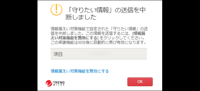 もし、意図して情報を送信したいのであれば、 上記画面のダイアログ内に表示されている「情報漏えい対策機能を無効にする」をクリックしてから、再度情報の送信を行ってください。 機能を無効にしてから30分後に、再び情報漏えい対策の設定が有効となります。 なお次項でも詳しくご説明していますが、 この情報のブロック機能は、登録した情報と外部に送信されようとしている情報とが「完全一致」した場合にのみ、 ブロック機能が動作するようになっています。 なので情報の登録の仕方によっては、大切な情報が何者かによって送信されようとしているのにもかかわらず、 ブロック機能が動作しない場合もあります。 また逆に、意図しない場合に情報の送信がブロックされてしまう可能性がある為、 登録する情報の内容には注意が必要です。 登録の仕方のコツについては、次項をご覧ください。 情報漏えい対策のキーワード登録のコツ