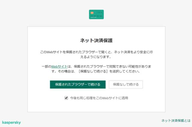 カスペルスキー セキュリティには、ネットバンクやショップでのオンライン決済を保護するための